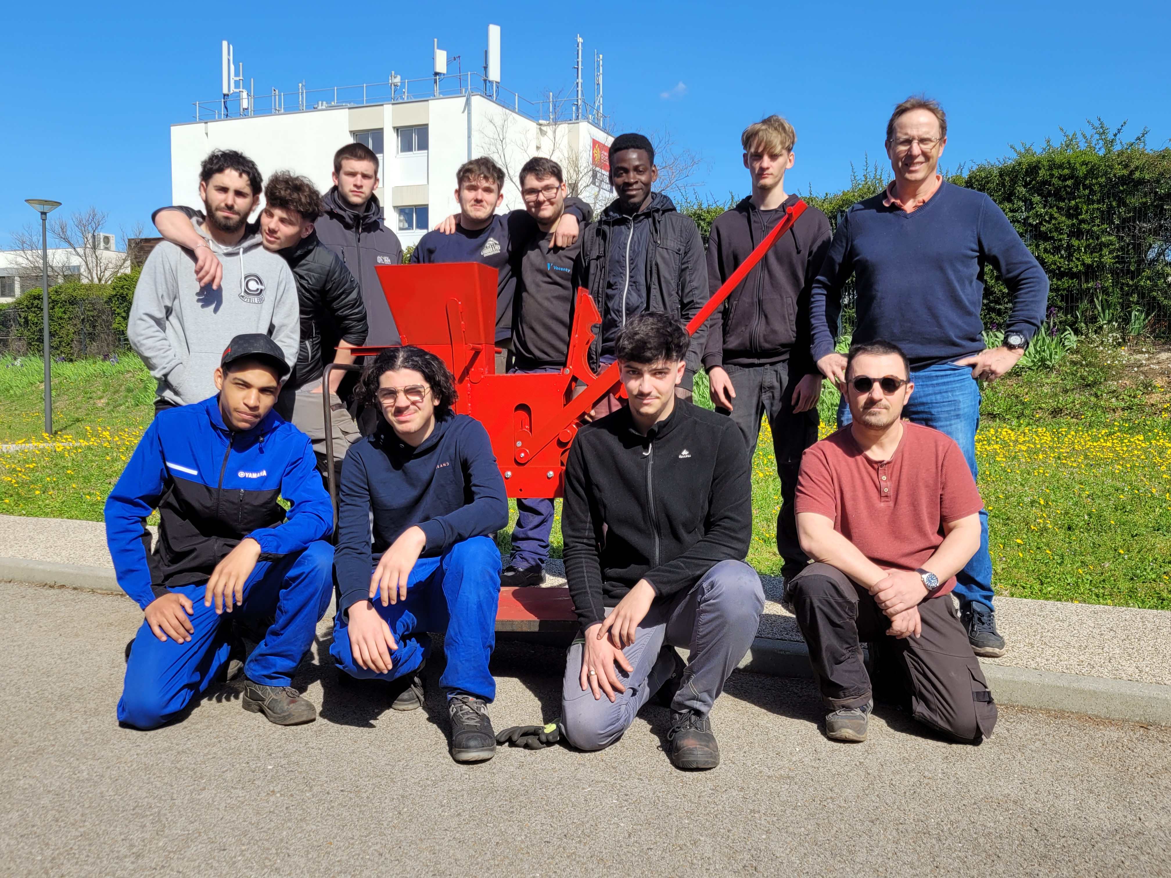 Ainsi, M. Clerc, M. Moutaouadhia, M. Gasmi et M. Sanchez ont participé à ce moment fort, la concrétisation d’un projet auquel le lycée Léonard de Vinci a contribué par la fabrication de la machine à briques.